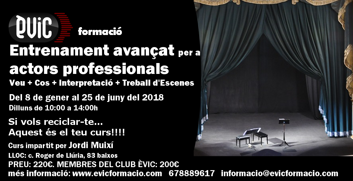 23 oct. Entrenament avançat per a actors professionals Obrim un nou curs d'entrenament per als professionals que volen reciclar-se. Únicament 10 places disponibles.