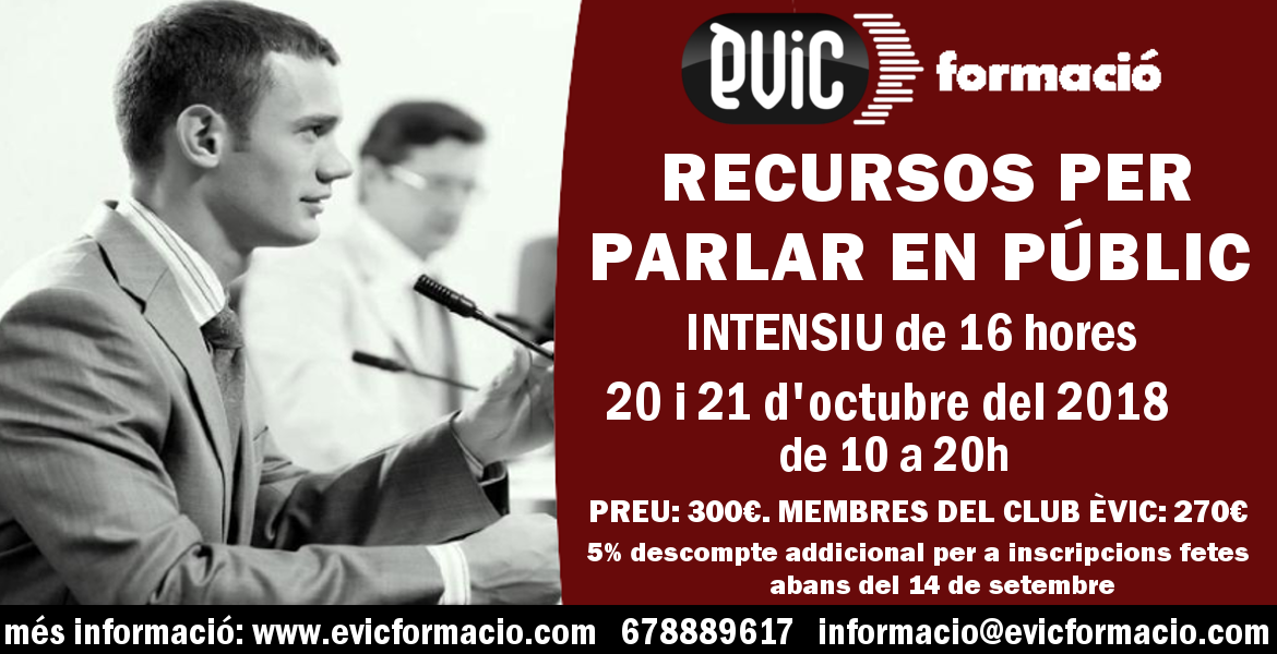 12 set. CURS COMPLET El curs "Recursos per Parlar en Públic" dels dies 15 i 16 ja està complet. La propera edició del curs tindrà lloc els dies 20 i 21 d'octubre i encara té places disponibles.