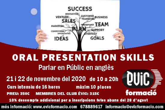Aquest cap de setmana s'ha dut a terme el curs "Oral Presentation Skills", el curs de parlar en públic en anglès. El curs, que havia esgotat les places disponibles, es va dur a terme amb èxit. Els alumnes van proposar d'obrir un segon nivell i un espai de pràctiques i així ho farem per a tots els alumnes que hagin cursat aquest curs.